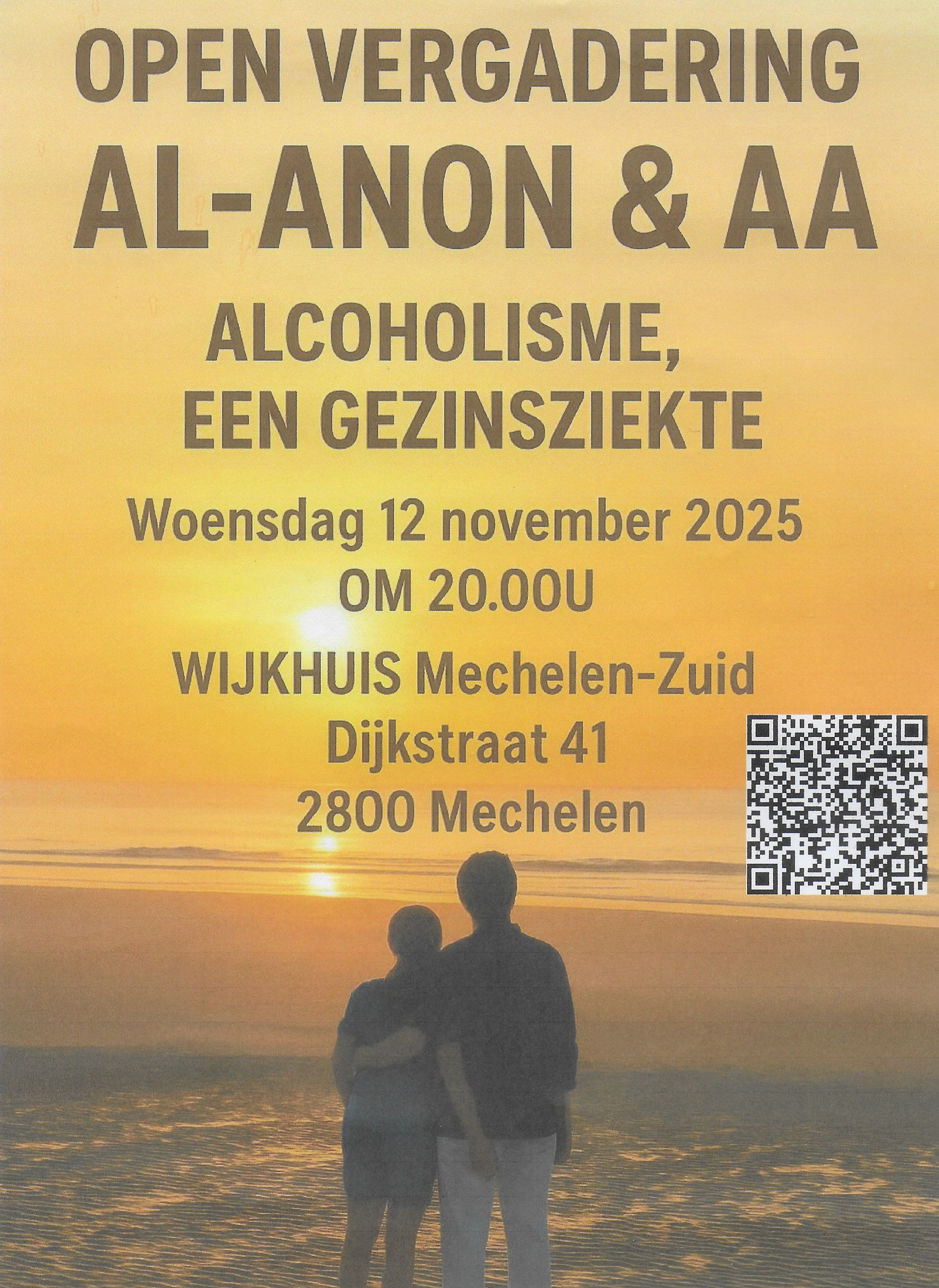 Op woensdag 12 november 2025 organiseren we samen met AA een Open Vergadering in het Wijkhuis Zuid-Mechelen Dijkstraat 41 2800 Mechelen om 20.00u.