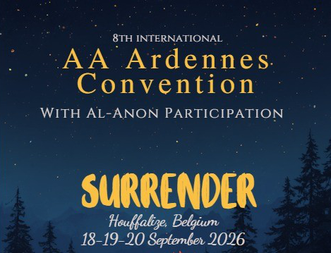 Terug 0 AA Ardennes Convention Algemeen Door AA-Vlaanderen 19-09-2026 AA Ardennes Convention Thema: 'Surrender' Zie flyer voor info